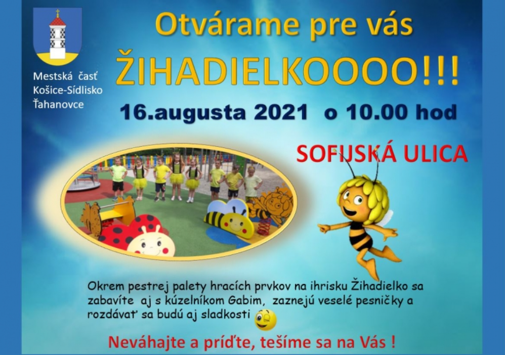 Mestská časť pozýva deti a ich rodičov na oslávenie úspechu v hlasovacej súťaži spoločnosti LIDL Slovakia o nové detské ihrisko. Okrem pestrej palety hracích prvkov na ihrisku Žihadielko sa deti zabavia aj s kúzelníkom Gabim, zaznejú veselé pesničky a rozdávať sa budú aj sladkosti. To všetko v pondelok 16. augusta 2021 na slávnostnom odovzdaní ihriska Žihadielko na Sofijskej ulici verejnosti.