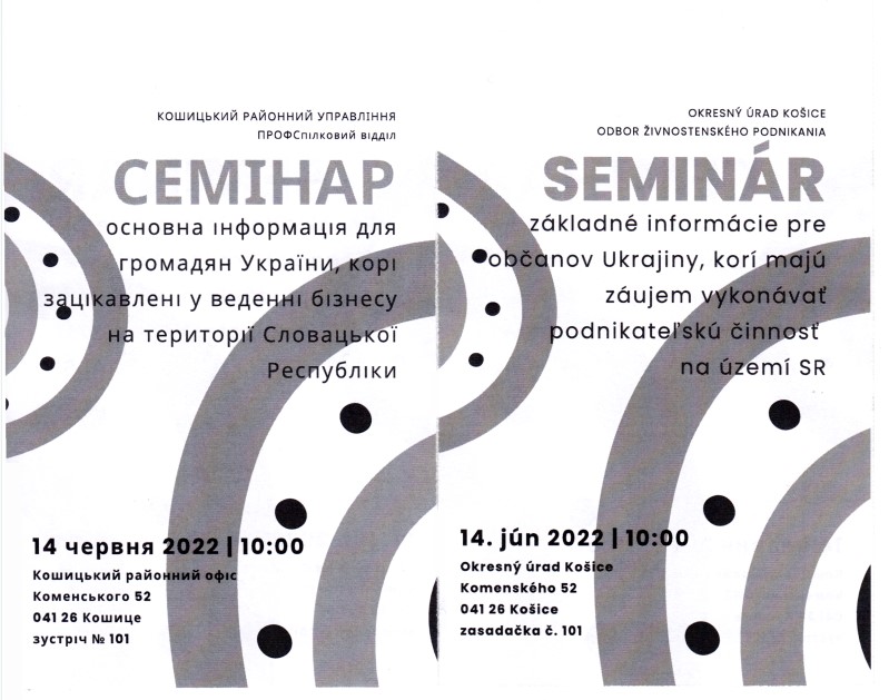 Okresný úrad Košice, odbor živnostenského podnikania organizuje 14. júna 2022 SEMINÁR pre občanov Ukrajiny, ktorí majú záujem vykonávať podnikateľskú činnosť na území SR. Seminár sa uskutoční v zasadačke č. 101 na Komenského 52 v Košiciach. Začiatok je o 10.00.