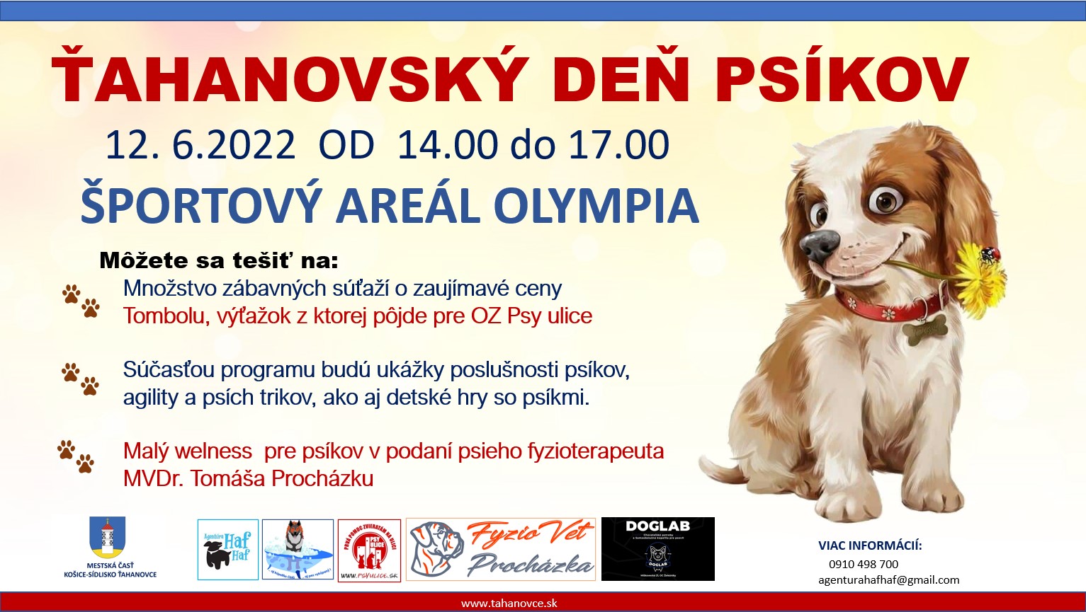 Ťahanovský deň psíkov. Podujatie sa koná 12.6.2022 od 14.00 do 17.00 hod. Miesto konania: Športový areál Olympia na Činskej ulici.