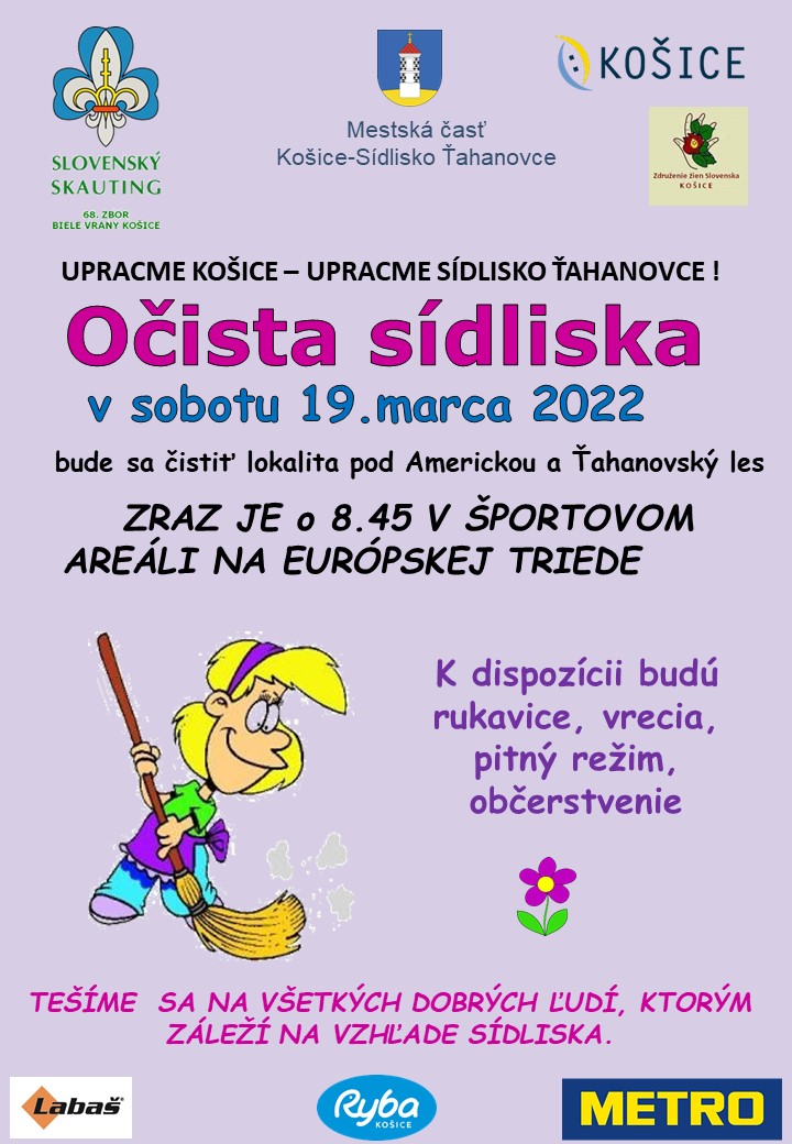 Mestská časť Košice-Sídlisko Ťahanovce v spolupráci s mestom Košice, Slovenským skautingom – 68. zbor Biele vrany Košice a Združením žien Slovenska Košice organizuje v sobotu 19. marca 2022 brigádu na očistu sídliska. Zraz je o 8.45 v športovom areáli na Európskej triede. K dispozícii budú rukavice, vrecia, pitný režim a občerstvenie.